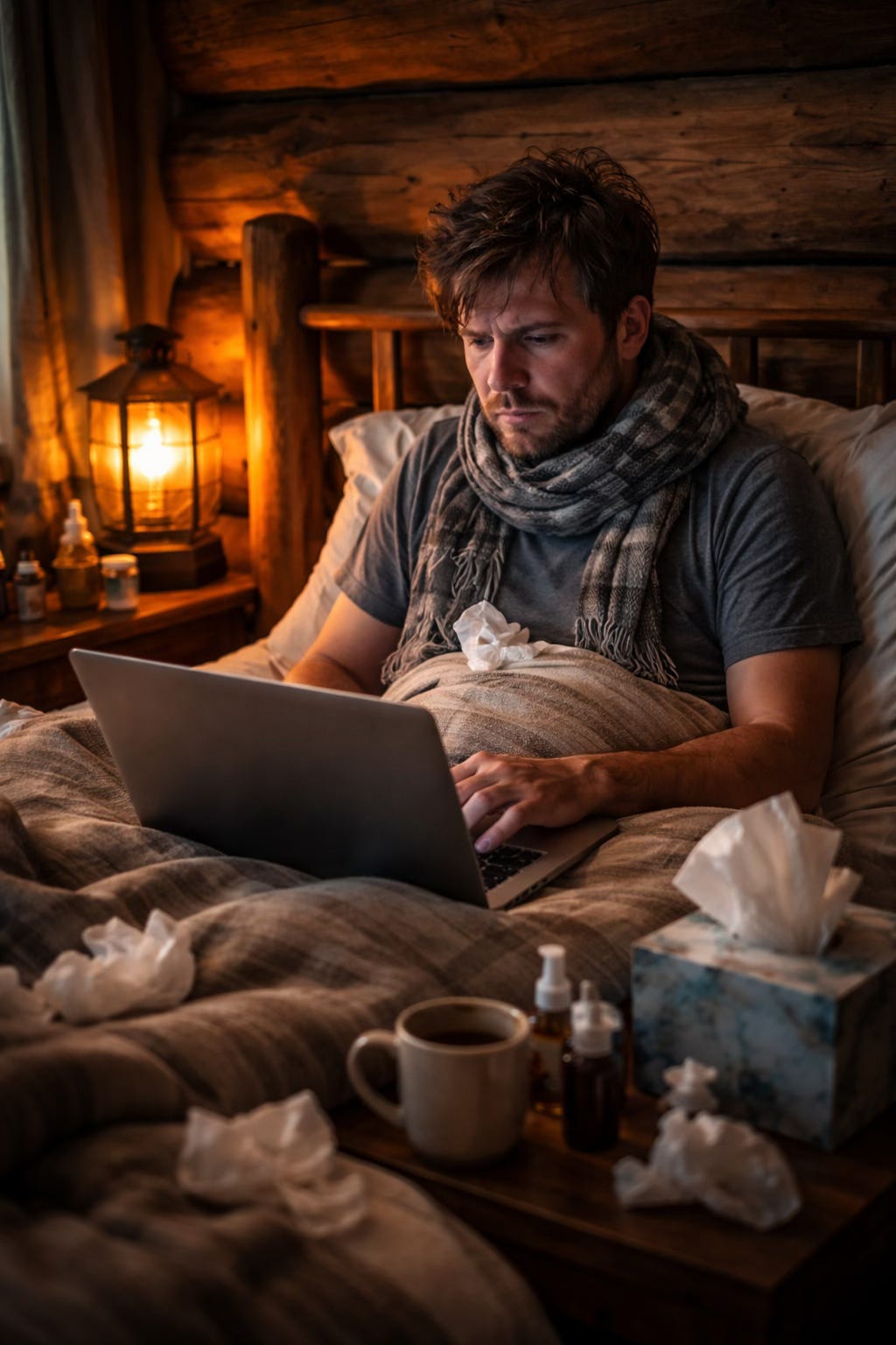 My head has been pounding for more than a week. It’s one of those headaches that, whenever you move, hammers your skull with each beat of your heart. No matter how much I blow my nose, it’s constantly full and what comes out is a radiant green. My chest is tight, my breathing is wheezy, and I’ve been hacking up things that I don’t even want to think about. I’ve had an on and off fever for nearly two weeks but it rarely comes on during the day. It likes to creep in while I’m sleeping. I wake up shivering and pile on the blankets, only to wake up a few hours later literally drenched in sweat so bad that I have to change my clothes. Then, I can’t cool down and pace around the cabin. It’s gotten so bad some nights I had to turn on some fans, just to get some relief. I’ve thought about going to the doctor but, even when I manage to drag myself out of bed and not feel like I’m going to pass out, the rain is so bad I don’t want to chance getting stuck in the mud somewhere.
